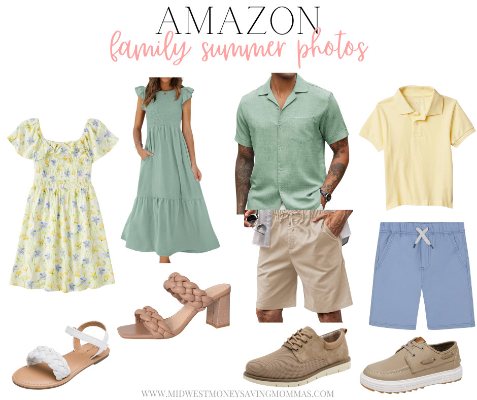 You also want to avoid being too matchy-matchy, instead of matching patterns we recommend choosing a color palette and sticking to those few colors. For example, we put together the outfits above from Amazon using sage green, yellow and khaki colors. Notice how we didn’t put everyone in the same color. Mom and Dad have similar outfit choices going on in green while the kiddos are matching in yellow. This is a great way to break it up but still ensure everyone is coordinating together nicely in the photos.